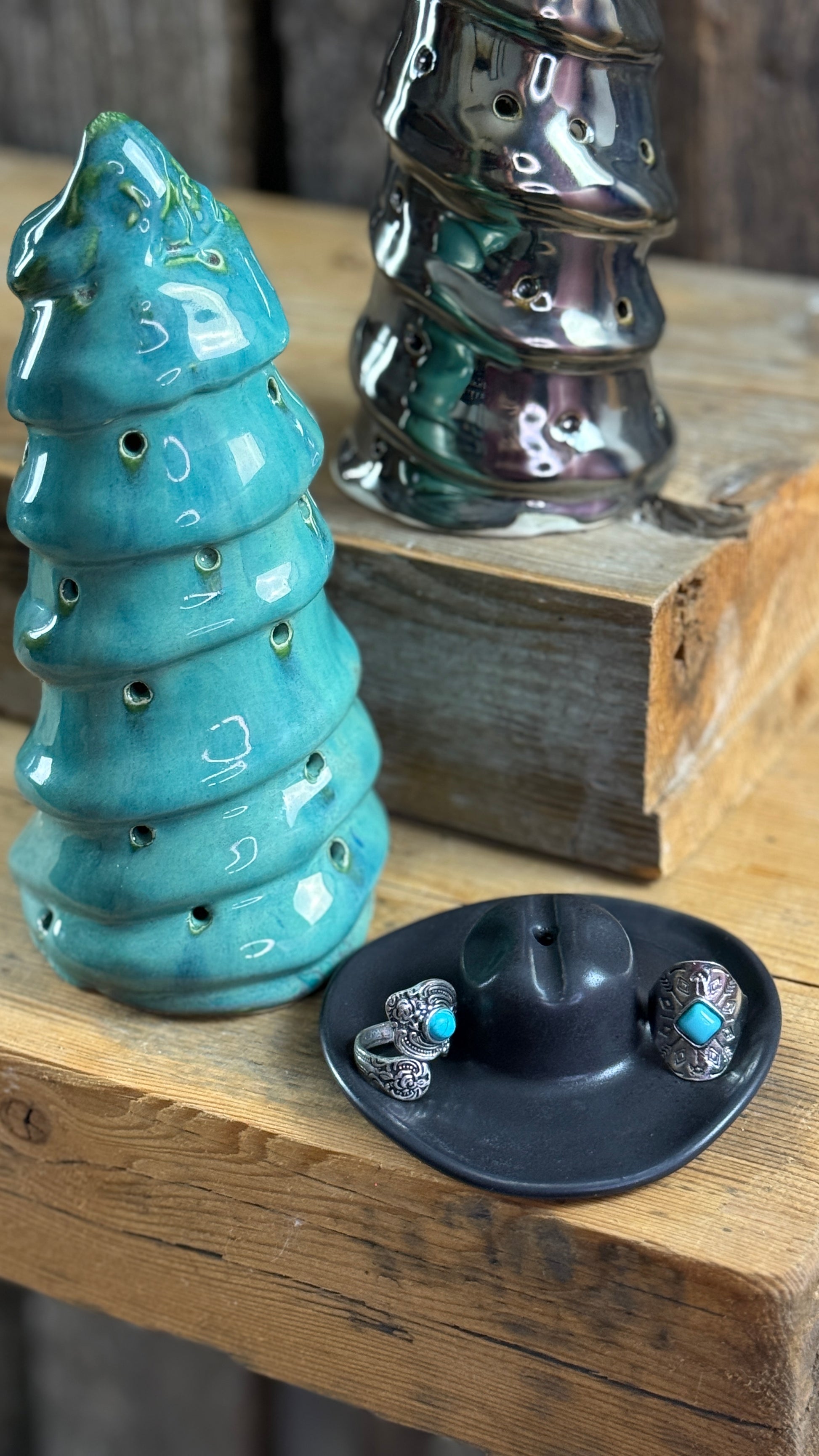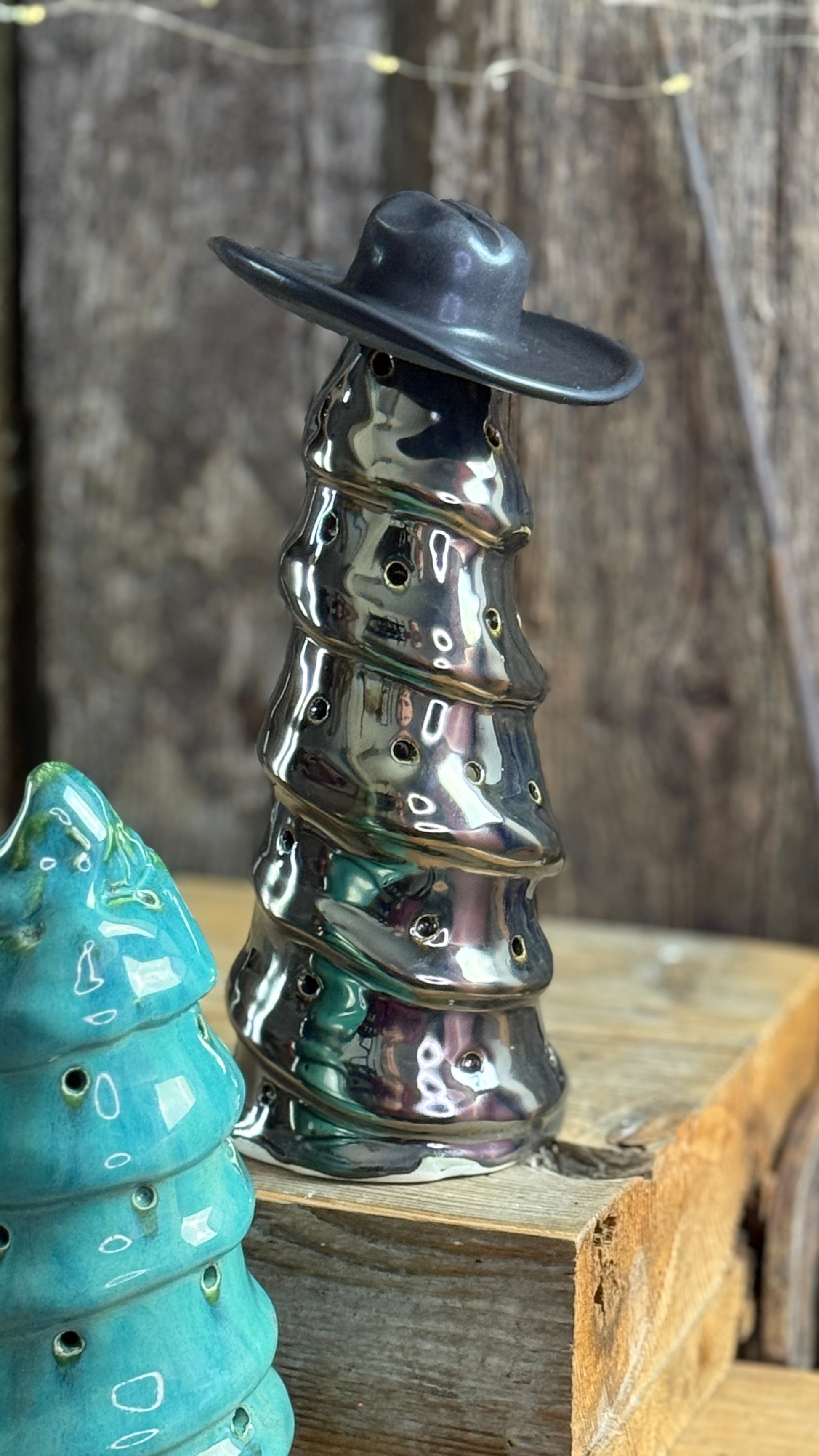 This duo of Cowboy Christmas tree luminaries brings western charm into your holiday décor. Each tree is completely handmade in my one woman Canadian studio and features a unique glaze finish: one in a turquoise green and the other in an antique silver, both accented with openings that cast a warm, inviting glow when lit.