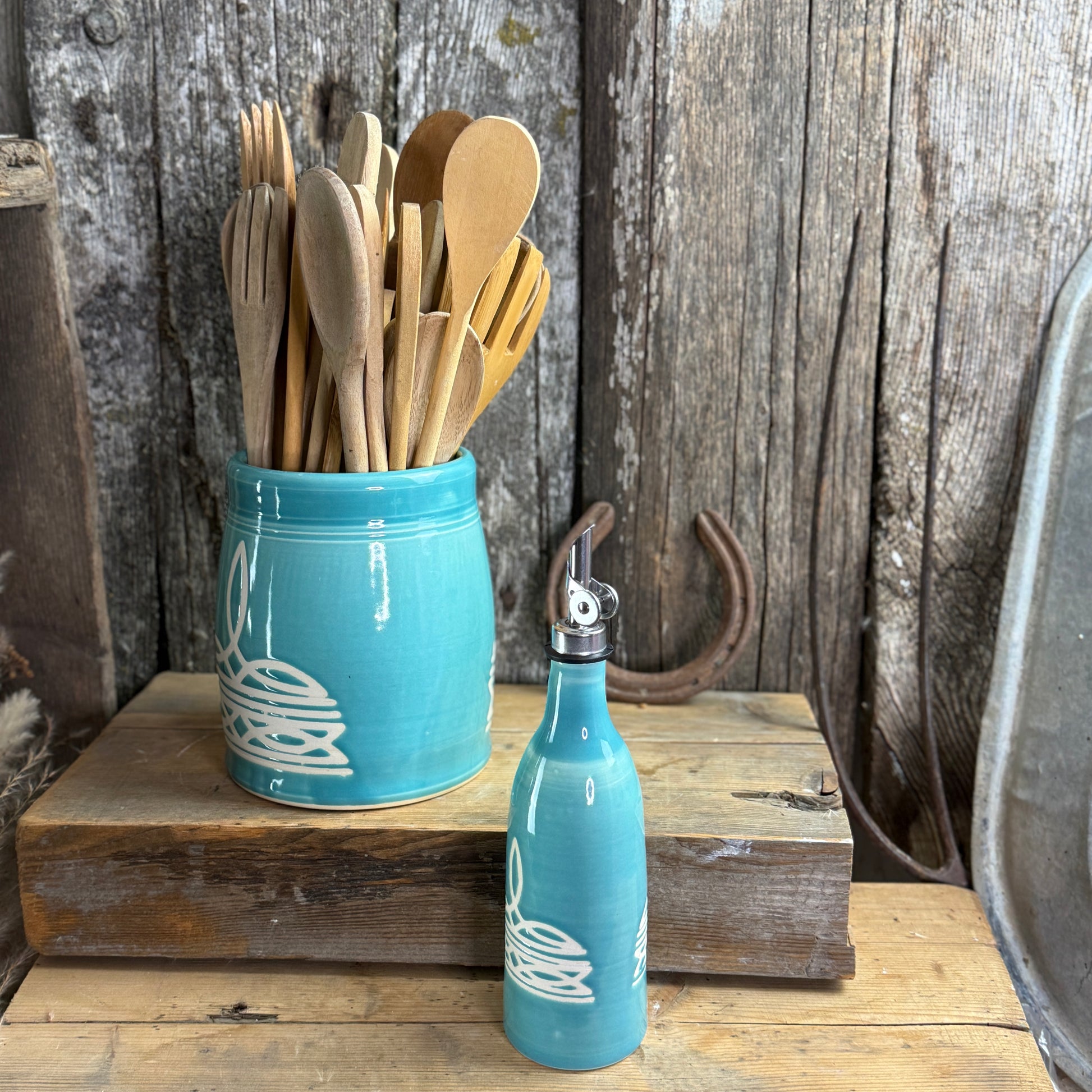 Kitchen Utensil Crock and oil bottle dispenser - Tiffany Turquoise