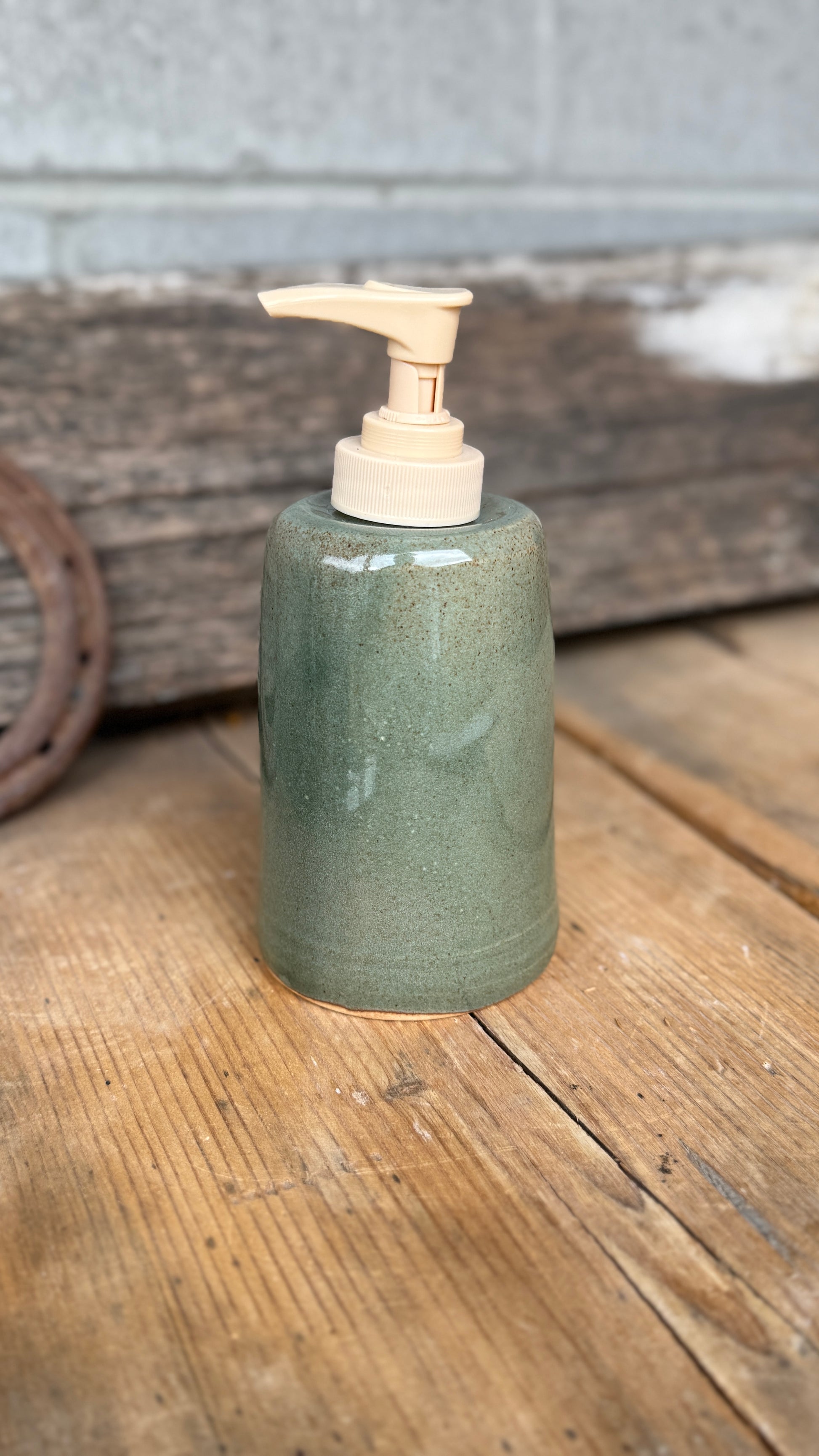 This set pairs a soap dispenser and oil bottle in the soft green of Sagebrush glaze. While slightly mismatched in their detailing, they still complement one another beautifully—creating a coordinated set that brings Western charm and functional art into your kitchen or bath.