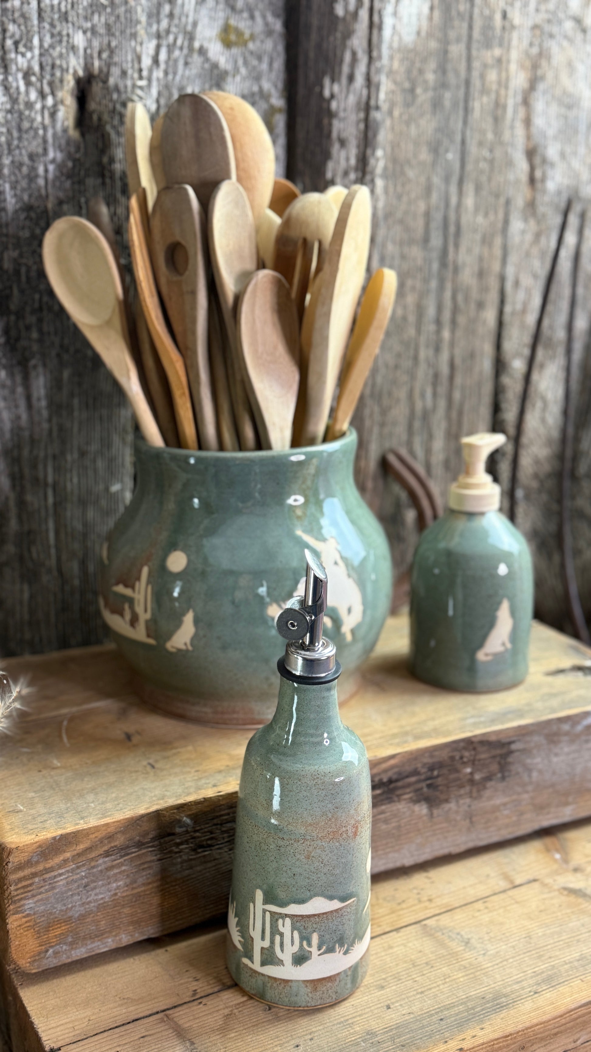 Kitchen crock set with oil and soap bottle- Desert Sagebrush
